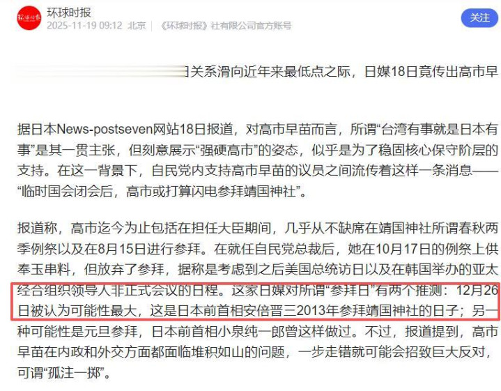 日本多家媒体之前就集体抛出重磅预言:日本首相高市早苗要在12月26日参拜靖国神社,现在距离26日仅剩一天!